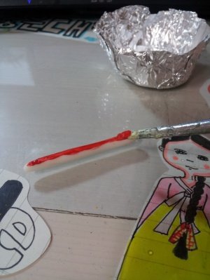 튀김가루를 바른 몸체가 어느정도 말랐다~싶으면 갈색아크릴물감에 물을 많이 타서