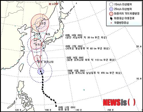 기상청은 "오늘 오후에 제주도를 시작으로 태풍의 영향을 받기 시작해 밤에는 남해안, 17일은 전국이 영향을 받겠다"면서 "중부지방은 18일 오전까지 이어지겠다"고 내다봤다.