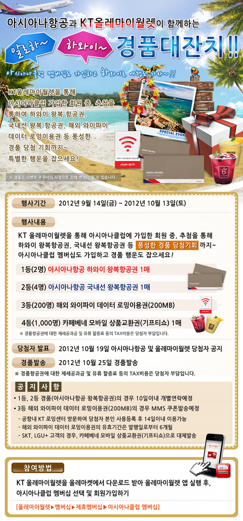 10월13일까지 이벤트를 진행하는데 이벤트 기간 중 올레 마이월렛을 통해 모바일 아시아나클럽 카드를 발급받은 회원을 대상으로 추첨을 통해 1등(2명)에게 하와이 왕복항공권을, 2등(4명)에게는 국내선 왕복항공권을 제공한다고 하니 여행가고 싶은 고객들에게는 안성맞춤인 이벤트인거 같아요 ^^