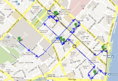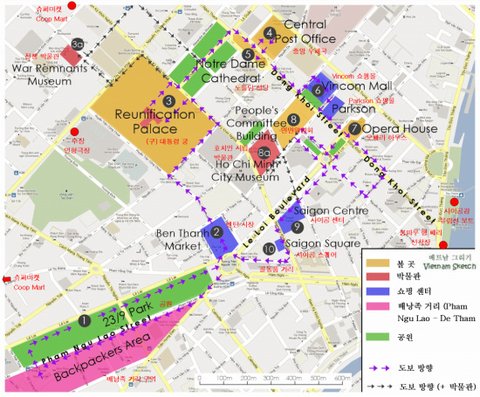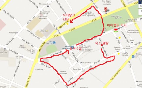 참고로 이게 우리가 아침동안 헤매었던 루트 사진ㅋㅋㅋ 숙소에서 출발해 BuI Vien거리에 위치한 circle K를 들렀다가 쭉쭉쭉 반대방향으로 이동해서 공원을 가로질러 다른 동네까지 넘어가 돈을뽑고 다시 여행자 거리인 De Tham 으로 돌아왔지요 ㅋㅋㅋㅋ