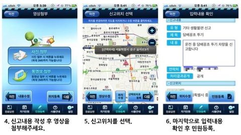 2. 스마트 폰 모바일앱으로 찍은 영상이나, 사진을 전송!!http://www.korea.go.kr/ptl/mobile/selectChannelList.do이건 생활불편 신고 앱인데, 이걸로 신고가 가능해요. 위에 주소로 가서 다운 받으세요!!