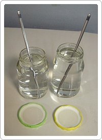 일단 열탕 소독을 해주어야 하는데요~ 유리병에 쇠젓가락을 넣고 팔팔 끓는 물을 가득~