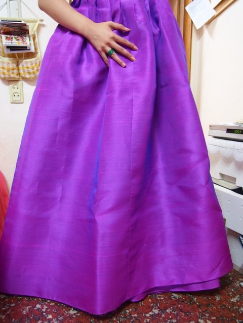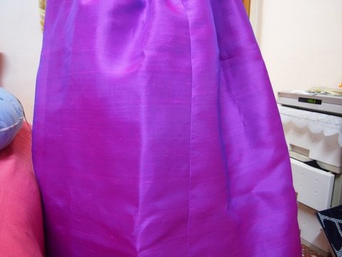 분홍실이 섞여서 짜인 보라색 옷감이라 투톤으로 굉장히 고급스러운 광택이에요.