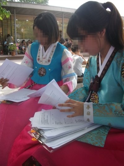 설문지를 아주 가볍게 한장짜리로 만들고, 한복을 빌려입거나(3명) 자기 한복(1명)을 입고 감.