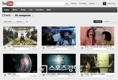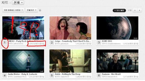 LMFAO의 Party Rock Anthem은 1,578,722명이 좋아한다고 되있고, 싸이의 강남스타일은 2,476,714명이 좋아한다고 되있습니다!!! 분명 4일 전 쯤까지는 가장 좋아하는 동영상 차트 1위에 강남스타일이 있었는데, 몇 일 전부터 강남스타일 자체가 없어졌습니다?!?!?! 분명 어제 기네스 세웠다고 세계에 알렸을텐데, 정작 유튜브에선 영상을 빼다니요????? 이게 어떻게 된겁니까????????????? 그리고 이뿐만이 아닙니다!