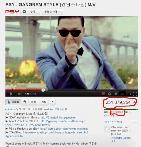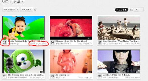 강남스타일은 조회수는 251,379,254로 현재 24위 Bruno Mars의 Just The Way You Are의 조회수 255,186,228에 밀린 유튜브 전체 조회수 25위에 랭크되있어야 됩니다! 정말 어처구니 없는게