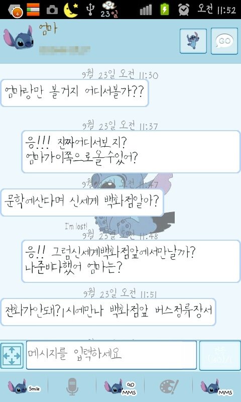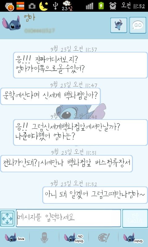 1시에 만나기로 했는데 9시에 일어나서 10시까지 놀다가 씻고! 준비 다~마치고 티비를 보고 있었는데 엄마한테 문자가 와있더라구요?