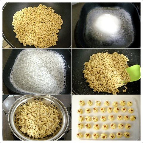 3. 끓인 시럽을 넣고 잣과 버무려 주세요~