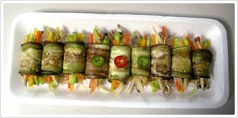 슬라이스한 가지 속에 채소볶음을 넣어 돌돌 말아주세요~