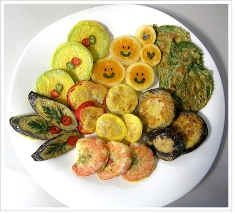 '호박전, 가지전, 단호박양파전, 파프리카전, 육원전, 새우전, 깻잎전, 표고전'