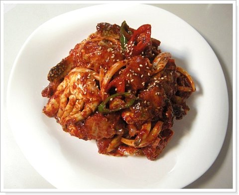 * 재료 : 꽃게 15마리(밑간 - 생강즙, 맛술, 식초 각각 2T), 청/홍고추, 양파, 대파