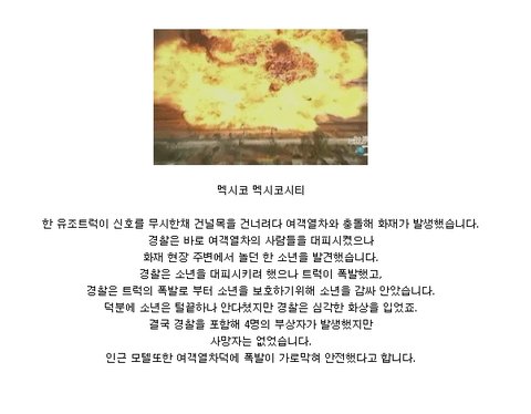 멕시코 멕시코시티 한 유조트럭이 신호를 무시한채 건널목을 건너려다 여객열차와 충돌해 화재가 발생했습니다.경찰은 바로 여객열차의 사람들을 대피시켰으나화재 현장 주변에서 놀던 한 소년을 발견했습니다.경찰은 소년을 대피시키려 했으나 트럭이 폭발했고,경찰은 트럭의 폭발로 부터 소년을 보호하기위해 소년을 감싸 안았습니다.덕분에 소년은 털끝하나 안다쳤지만 경찰은 심각한 화상을 입었죠.결국 경찰을 포함해 4명의 부상자가 발생했지만사망자는 없었습니다.인근 모텔또한 여객열차덕에 폭발이 가로막혀 안전했다고 합니다.