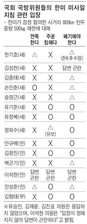 여야 국방위원 대다수는 한미 미사일지침을 폐기하거나 이번 협상 결과가 나온 뒤 재협상을 통해 개정해야 한다고 답했다. 일정 시점 후에 폐기해야 한다는 의원은 새누리당 유기준 유정복 정희수, 민주당 안규백 김광진, 무소속 김형태 의원 등 6명이었다.