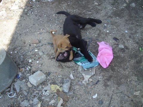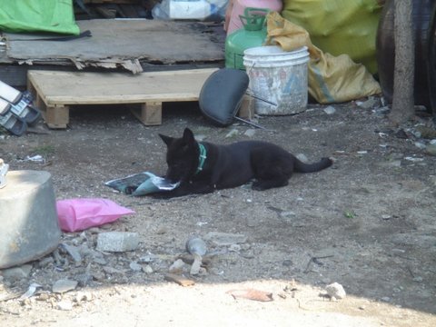 멀리서 혼자 비닐봉투와 씨름하던 검둥이에게