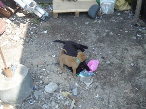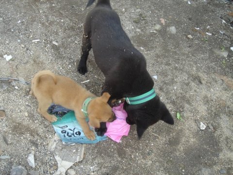 쫄랑쫄랑 가더니 비닐봉지 강탈. 검둥이는 구석에서