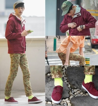 밀리터리패턴 바지와 모자에 와인색 바람막이와 반스 마데로 와인컬러의 스니커즈깔맞춤으로