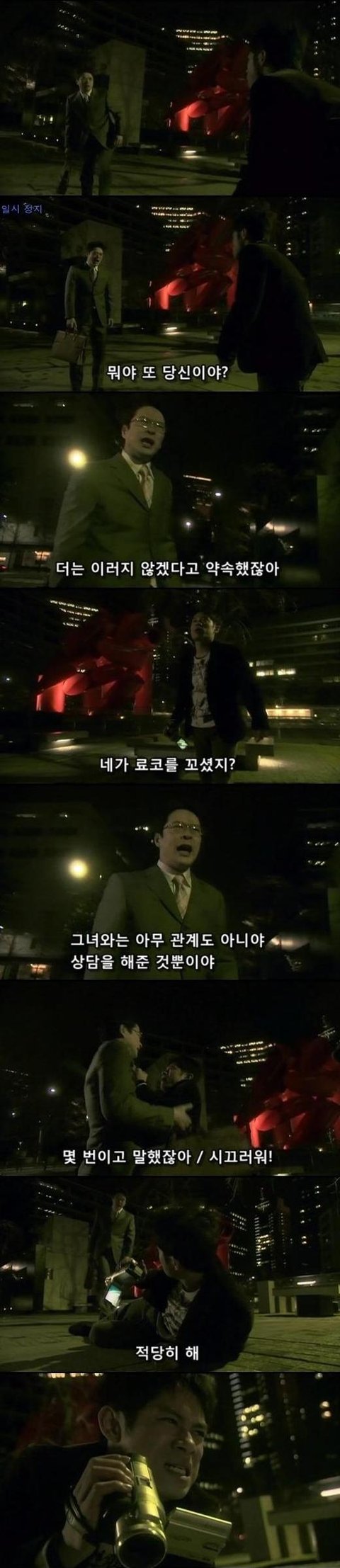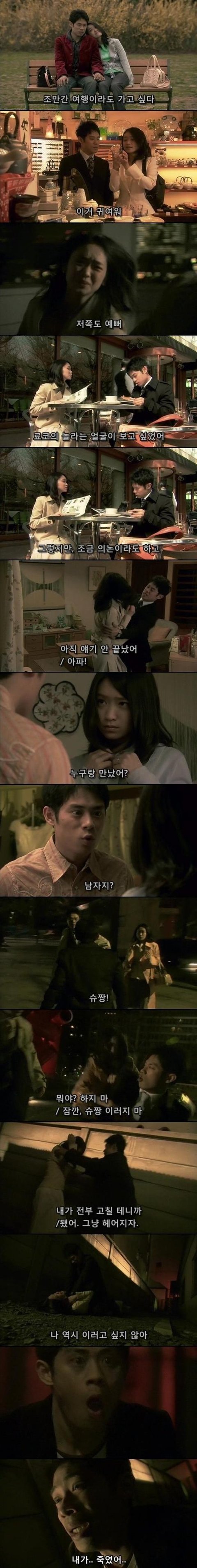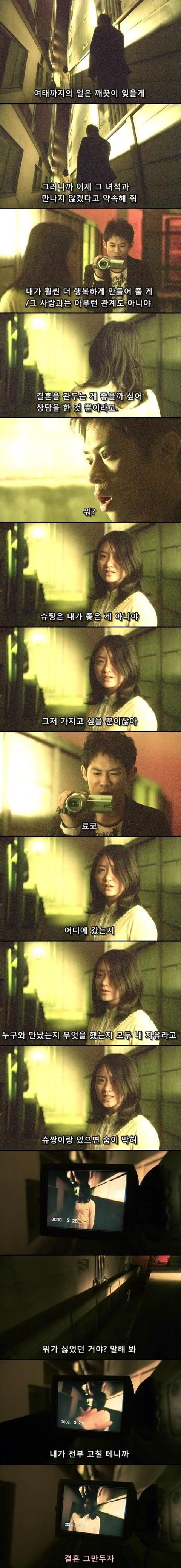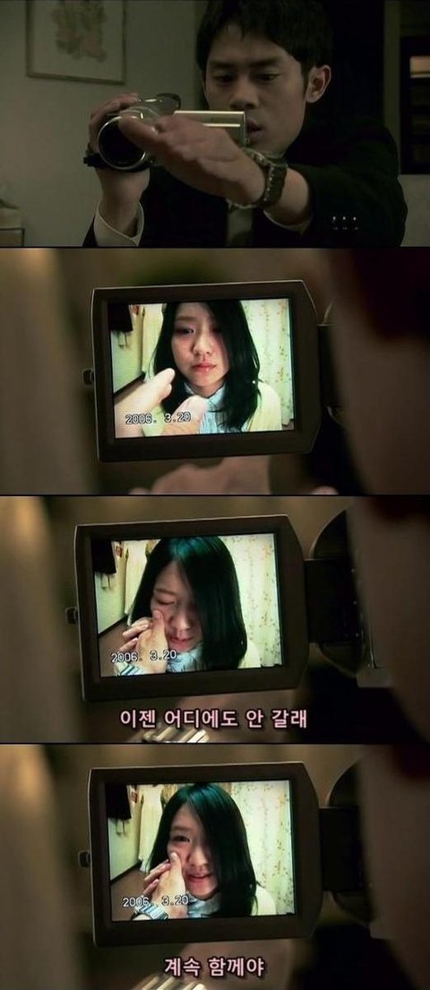 그리고 회사에서 나오는 그 남자를 발견하는데, 그 옆에 약혼녀가 걷고 있음. 하지만 여주는 캠코더를 통해서만 볼수 있으니 실제로 보이는것은 남자 혼자 걷고 있는 모습뿐..