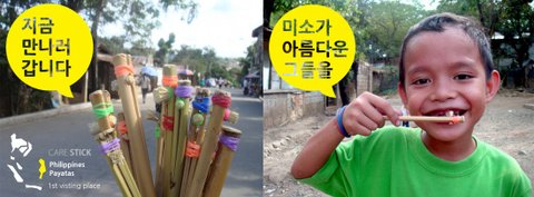 하지만... 그들의 미소속엔 아픔이 있었고, 고통이 있었습니다. 구강치료기간이 적고, 열약한 그들에겐 충치예방은 사치였던 것입니다. 그래서 가공하기 쉬운 대나무와 동남아시아의 치주성분이 있는 림나무를 이용하여 누구나 손쉽게 만들 수 있는 칫솔! ‘케어스틱’을 제안하였고 하이스코의 지원을 받아 현지에서 제작, 분배하는 시간을 가졌습니다.