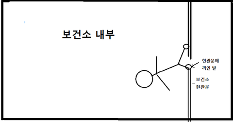 저는 온몸에 소름이 돋았고, 제 발끝은 현관문과 안마기기들 사이의 공간에서 대각선으로 뉘여진 자세 때문에 현관문 바깥에 일부가 나와 있었습니다. 이 보건소의 문은 밀고 당기는 문이였으며, 나무문이었습니다.