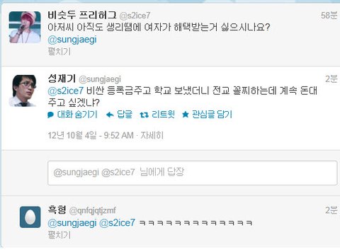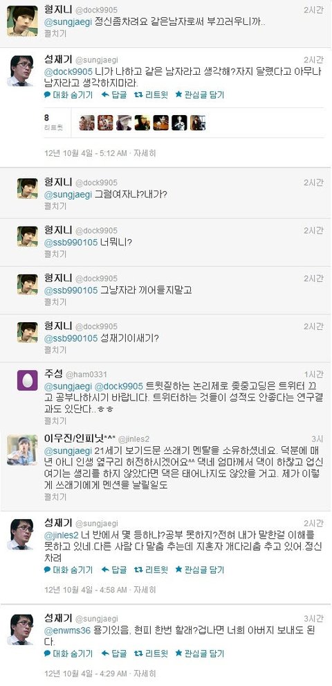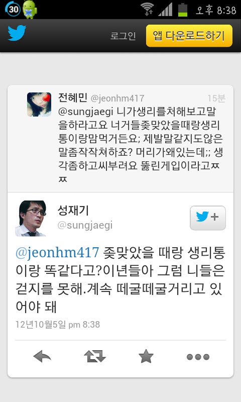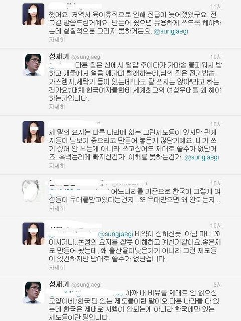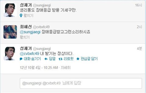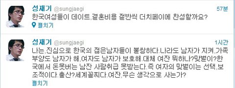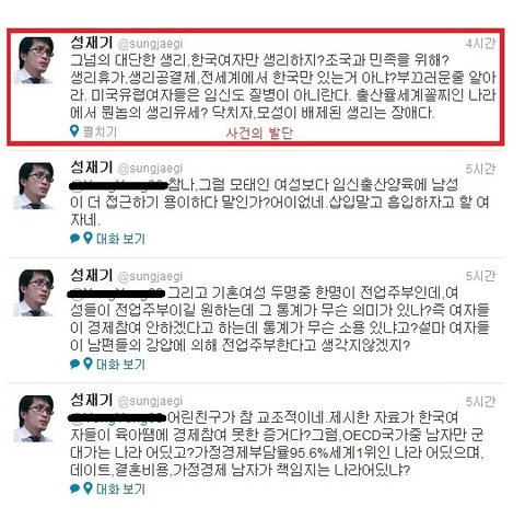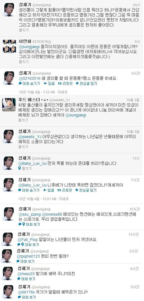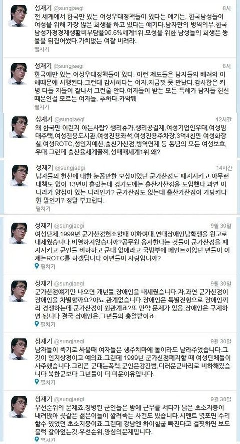 내가 평소에 여자들 쪽에서 이해해주고 글쓰는 편인데 솔직히 이번만큼은 성재기라는분이 말은 과격하게 쓰고 있으나 틀린말 하나 없다 생각합니다..잘못된 점을 구지 꼬집자면 여자들에게 반감을 살만하게 호전적인 글을 쓰고 있다는 점이죠.여자분들에게 신체구조상 일어나는 생리의 불편함은 대다수 남자들이 다 알고 있으며 저 같은 경우에도 여자친구나 주변에 친한 이성친구가 아프다고 하소연 하면 대신 아파주고 싶을 정도인데 누가 그걸 모르겠나요. 문제는 그걸 악용해서 사회에 쓰고 있다는 점이죠. 그리고 여성에게 부여된 혜택들 역시 악용하는 사례가 심심치 않게 있는 걸로 알고 있어요.근데 남자들이 왜 이 문제에 대해서 따지고 언급하지 못하냐면 그래도 여자들이 아직도 사회의 약자라는 점을 인식하고 있고또 실제로 제 주변만 보더라도 개념녀가 다수 존재한다는 점을 알고 있기 때문에눈 감아주고 있는 거라고 생각하네요.생리라는 걸로 악용하시는 녀자분들..제발 진심으로 아파서 생리하시는 여성분들에게 피해좀 주지마세요.이게 다 당신들 때문에 벌어지는 일들 입니다.그리고 아까 이 분 관련 뉴스기사를 봤는데 어떤 여성분이 대충 이렇게 글쓰셨더라고요.'나 여자인데 솔직히 성재기라는 사람 말 틀린거 하나 없다고 생각한다. 다만, 이걸 트위터에서어린애들과 시끄럽게 말다툼하는 수준하며 꼬라지가 우습다. 실제로 보면 정치계에서는 이 이야기의 언급조차 안하는데 혼자 트위터에서 떠들면 무엇을 할 것인가? 참고로 정치인사 대부분은 남자다.'