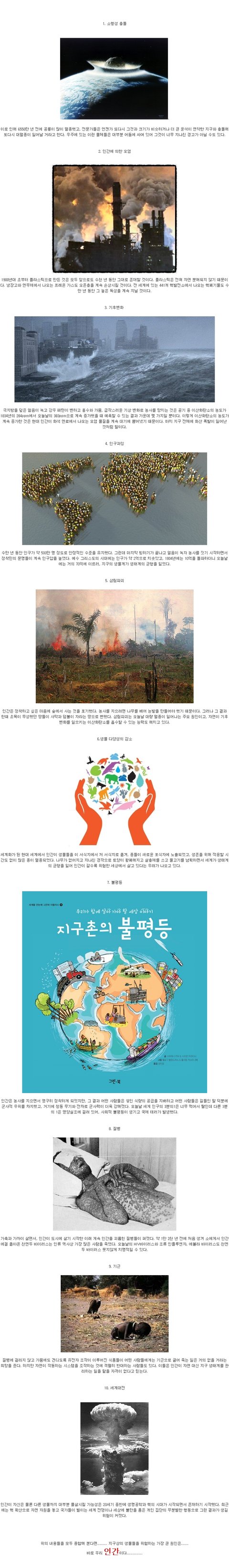1. 소행성 충돌이로 인해 6500만 년 전에 공룡이 멸종했고, 전문가들은 언젠가 또다시 그것과 크기가 비슷하거나 더 큰 운석이 지구와 충돌해 또다시 대멸종이 일어날 거라고 한다. 우주에 있는 이런 물체들은 대부분 어둠에 싸여 있어 그것이 너무 지나친 경고가 아닐 수도 있다. 2. 인간에 의한 오염1900년대 초부터 플라스틱으로 만든 것은 모두 앞으로 수천 년 동안 그대로 존재할 것이다. 플라스틱은 전혀 자연 분해되지 않기 때문이다. 냉장고와 연무제에서 나오는 프레온 가스도 오존층을 계속 손상시킬 것이다. 전 세계에 있는 441개 핵발전소에서 나오는 핵폐기물도 수만 년 동안 그 높은 독성을 계속 지닐 것이다. 3. 기후변화극지방을 덮은 얼음이 녹고 강우 패턴이 변하고 홍수와 가뭄, 급작스러운 기상 변화로 농사를 망치는 것은 공기 중 이산화탄소의 농도가 1834년의 284ppm에서 오늘날의 383ppm으로 계속 증가했을 때 예측할 수 있는 결과 가운데 몇 가지일 뿐이다. 이렇게 이산화탄소의 농도가 계속 증가한 것은 현대 인간이 화석 연료에서 나오는 오염 물질을 계속 대기에 뿜어냈기 때문이다. 마치 지구 전체에 화산 폭발이 일어난 것처럼 말이다. 4. 인구과잉수만 년 동안 인구가 약 500만 명 정도로 안정적인 수준을 유지했다. 그런데 마지막 빙하기가 끝나고 얼음이 녹자 농사를 짓기 시작하면서 정착민의 문명들이 계속 인구압을 높였다. 예수 그리스도의 시대에는 인구가 약 2억으로 치솟았고, 1804년에는 10억을 돌파하더니 오늘날에는 거의 70억에 이르러, 지구의 생물계가 생태계의 균형을 잃었다. 5. 삼림파괴인간은 정착하고 싶은 마음에 숲에서 사는 것을 포기했다. 농사를 지으려면 나무를 베어 논밭을 만들어야 했기 때문이다. 그러나 그 결과 한때 초목이 무성했던 땅들이 사막과 덤불이 자라는 땅으로 변했다. 삼림파괴는 오늘날 대량 멸종이 일어나는 주요 원인이고, 자연이 기후변화를 일으키는 이산화탄소를 흡수할 수 있는 능력도 해치고 있다.