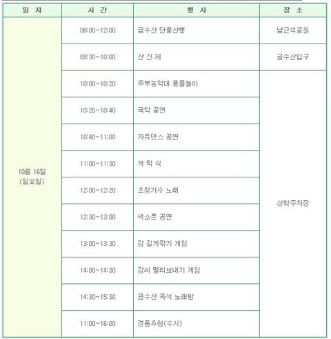 축제기간 동안에는 가을 단풍의 멋을 한껏 만끽할 수 있는 테마 단풍길 걷기, 금수산 등산대회, 산신제 재현, 노래자랑 등의 다양한 행사가 마련되어 있으며, 또한 "미녀가 누워있는 모습을 하고 있다" 하여 "미녀봉"이라 명명된 이 곳을 배경으로, 축제에 참여하시는 방문객 여러분들께 무료로 사진을 촬영해 드리는 체험행사도 하여 매년 그 열기를 더해가고 있다