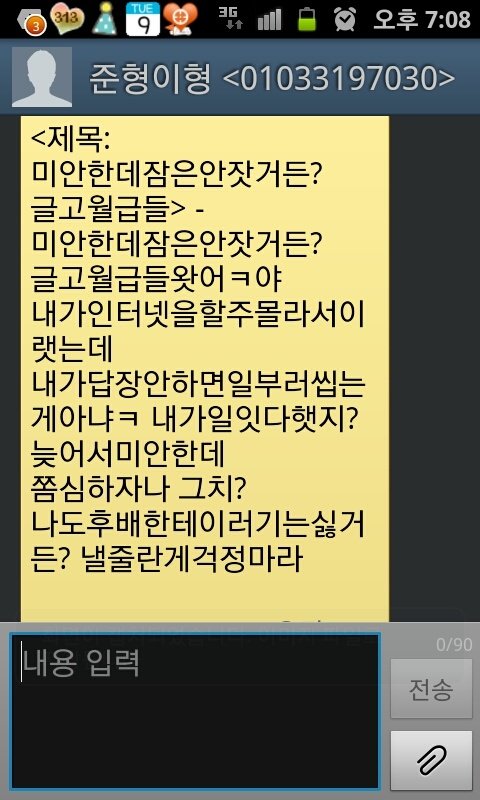 내가 도와줄께 정신차리고 얼른연락하자 아니면 나진짜 큰맘먹고 너희 부모님이나 여자친구에게 전화해서 돈받을지도몰라 그렇게되면 너도 힘들고 나도힘들잖니 줏빠지게 훈련받고 휴가받아 나왓는데 부모님 얼굴 보기 편하겟다참..