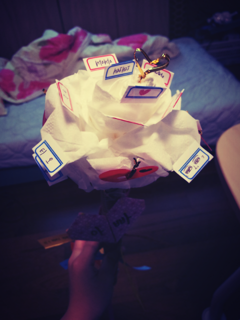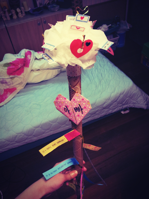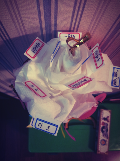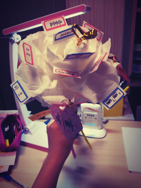 어? 그런데 휴지와 포장지를 보니 휴지로 장미를 만든다음 포장지도 지지대를 하면 되겠다!하며 일단 휴지꽃이 탄생했어요ㅋ 그런다음 꽃에 작은 메세지들과 하트들 그리고 황금빵끈으로 가운데 포인트![]()