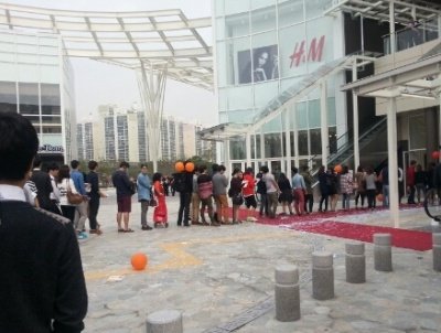 캬, 공짜가 좋긴 한가 봄! 늘어선 줄이 짧아질 생각을 안 함~