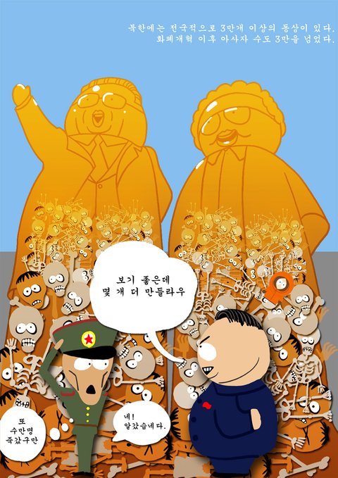저렇게 만들어대는 동상에 쏟아붓는 돈이라면 지난 여름의 수해 피해도, 굶어죽는 아이들도 없지 않을까 싶은데......