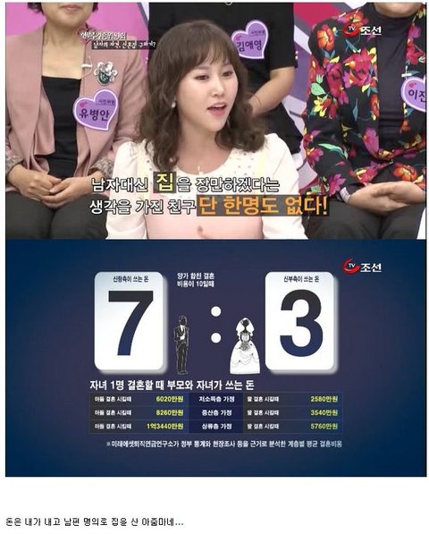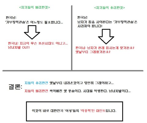 여자들은 남자들에게 시대가 어느시댄데 가부장적인 사고를 갖고있냐고 비난하지만. 남자는 집을 해와야한다는 구시대적 사고는 그들에게 유리한거기때문에 포기하지않는다. 이것이 한국여자들의.이중성