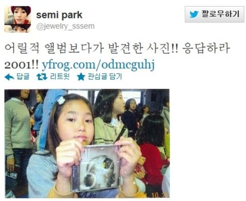 세미는 최근 자신의 트위터를 통해 “어릴적 앨범보다가 발견한 사진!!응답하라2001!!”라는 글과 함께 초등학교 5학년 당시 열혈 팬이었던 그룹 H.O.T 3집 앨범 CD를 들고 찍은 사진을 올렸다. 늘씬한 몸매와 여성미 가득한 현재의 모습과는 달리 젖살이 통통하게 오른 귀여운 모습이 눈에 띈다..