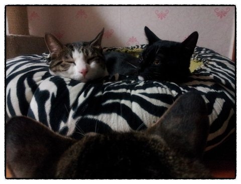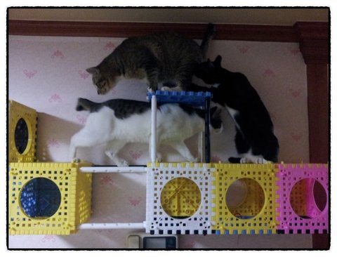 벽에 달아준 캣타워 위에서 꼬리잡기놀이~~