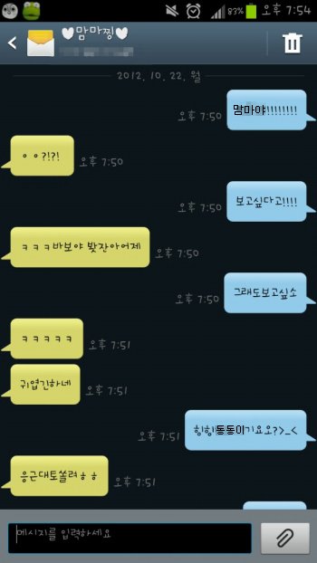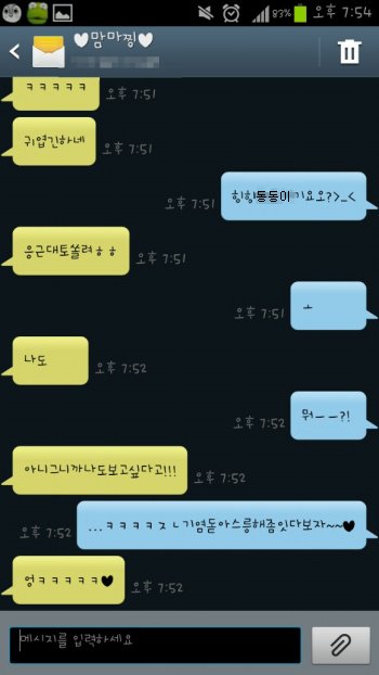 (+아 그리고 오해잇을까봐 그러는데 맘마가 하는말중에 ㅋㅋㅋㅋ바보야 봣잔아어제 < 이말 오늘학교에서 얼굴못맞아서 어제봣다는고에용 !! 그래서 나가는거에요 ~~ 그럼 한번더 마지막으로 굿밤~)