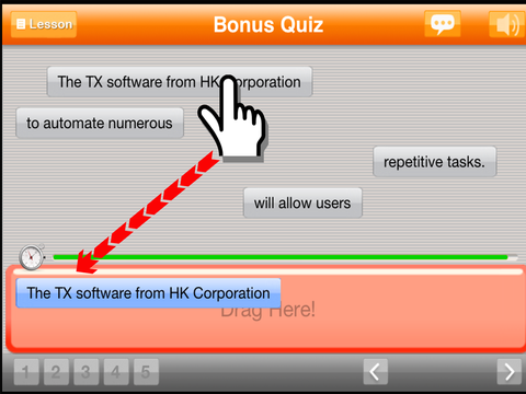 학습자는터치스크린의 드래그 앤 드랍 (Drag & Drop) 기능을 이용해서 덩어리(Chunk)나 단어로 나누어진 문장을 완성하여 학습하게 된다.
