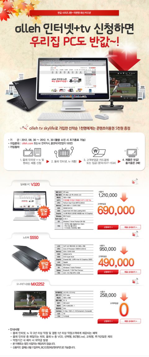 올레닷컴 센스쟁이 ㅋㅋㅋ 올레닷컴에서 올레TV와 인터넷을 동시 신규가입하면 일체형 PC나 노트북을 반값 가격 수준으로 구입하거나, 22인치 LED 모니터를 받을 수 있는 이벤트를 하고 있는데요