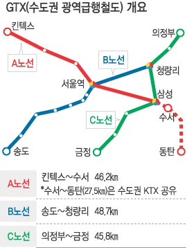 수도권 광역급행철도(GTX)가 개통하면 유엔 녹색기후기금(GCF) 사무국이 들어설 인천경제자유구역 송도국제도시에서 서울역까지 27분이면 갈 수 있는 것으로 조사됐다.22일 국토해양부에 따르면 현재 정부가 추진 중인 수도권 광역급행철도 3개 노선 가운데 ‘B노선’은 인천 송도에서 부평, 당아래, 신도림, 여의도, 용산역, 서울역을 거쳐 청량리까지 총 48.7㎞로 건설될 예정이다. 광역급행철도는 최고 시속 200㎞, 평균 시속 100㎞로 송도에서 용산역까지는 20여분 만에 갈 수 있다.