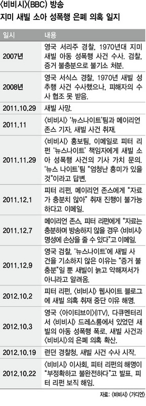 수사당국의 무능함이 생전에 새빌에게 면죄부를 주기는 했지만, '성(Saint) 새빌'의 '데빌'(악마) 같은 두 얼굴을 덮어준 일등공신은 <비비시>다. 실제로 <비비시>의 '뉴스나이트' 팀은 지난해 10월 말 새빌이 숨진 이후 아동 성폭행 사건을 취재했다. 그러나 책임자인 리펀은 "자료가 충분하지 않다"며 더이상의 취재와 보도를 막았다. 취재 기자가 "자료는 충분하며, 방송하지 않으면 <비비시>의 명성에 상처를 줄 수도 있다"고 항변했지만 통하지 않았다. 대신 <비비시>는 새빌 추모 방송 세편을 내보냈다.