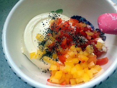 1. 크림치즈100g + 다진 파프리카 + 후추 를 섞어 동그랗게 모양을 만들어주세요.