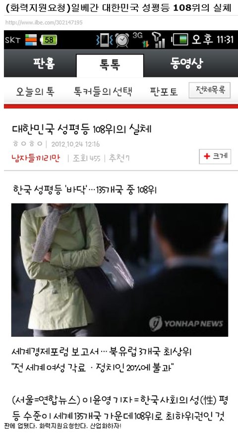 대한민국 성평등 108위의 실체 톡톡 > 남자들끼리만 | ㅎㅇㅎㅇ (판) 2012.10.24 12:16 조회7,431 스크랩0 한국 성평등 '바닥'…135개국 중 108위"전 세계 여성 각료·정치인 20%에 불과"