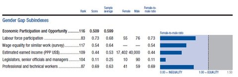 원글자의 문제는 바로 여성들의 경제참여율 저조현상이 무슨 이유에서인지 모르는 것에 있다. 위의 그래프에서 교육수준과 경제활동 사이의 간격을 가리켜 비교하고 있는데, 실상 위의 자세한 숫자지표와 랭크순위를 보면 경제참여 116위, 교육수준도 그에 못지 않은 99위에랭크되어 있는 것을 알 수 있다. 경제참여 기회가 하위권이니 참여율이 시망인게 당연하지, 그걸 지만 모르고 있음.