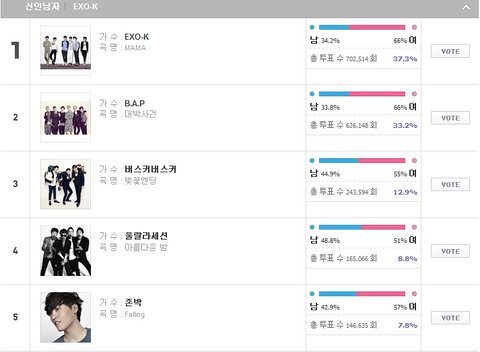 싸이가 어디에도 1위가 아닌것도 웃기고 남자신인 1위가 EXO-K인것도 웃기다
