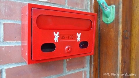 한옥대문 앞에 뜬금없이 앙증맞은 우편함.