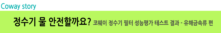 어느덧 코웨이 정수기 필터 성능평가 테스트 결과 마지막 편입니다. 환경호르몬 편을 시작으로 소독부산물 편, 의약물질 편을 이야기 드렸는데요. 오늘은 그 마지막 시간으로 유해금속류/기타 물질 편에 대해서 알려 드리겠습니다.