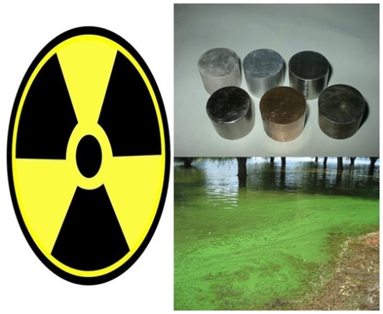 <좌: 방사능 마크, 우 : 위 – 유해금속류, 아래 – 녹조현상>