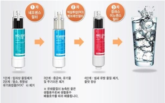 코웨이 정수기 필터 및 시스템의 8인치 small 사이즈 RO, UF 및 NF(나노 필터)를 사용하여, 통수량 100 L 이상으로 유해물질을 여과시키는 방법을 적용해 최근 이슈가 된 방사성 물질 및 발암가능성이 높은 무기금속류 등 15종에 대한 제거성능 테스트를 실시한 결과, 유해금속류 및 기타 물질 15항목 중 아래 8 항목의 경우 RO system에서 99.9% 제거되는 것으로 나타났습니다.