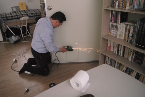 문에 구멍을 뚫었습니다. 자신의 힘으론 역부족이라 동네 전기톱아저씨 불러서 정식적으로 의뢰를...