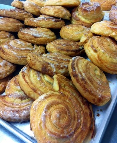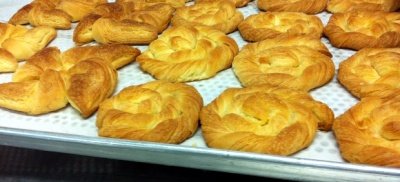 페이스츄리 반죽을 돌돌 말아서 달팽이처럼 만들어 구운후 위에 슈가파우더(분당)을 녹여 발라준후 2차로 간단하게 구워나옵니다