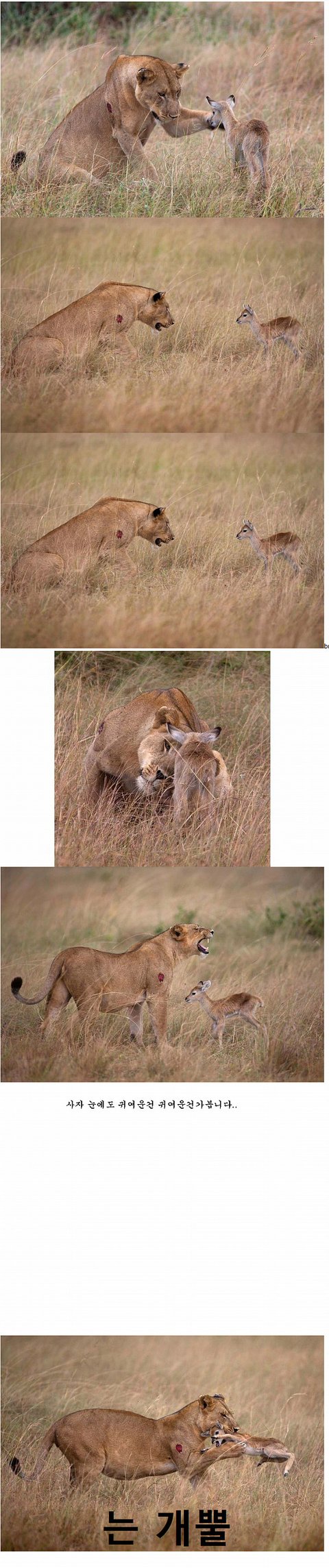사실 이 사진은 사자가 새끼사슴을 자기 새끼들처럼 목물고 옮기고 그랬다는 그사진 입니다. 있을수없는 일이지만 사자가 사슴을 돌봐주는 것입니다.