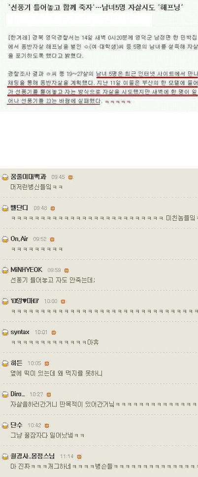ㅋㅋㅋㅋㅋㅋㅋㅋㅋㅋㅋㅋㅋㅋㅋㅋㅋㅋㅋㅋㅋㅋㅋㅋㅋㅋㅋㅋㅋㅋㅋㅋㅋㅋㅋㅋㅋㅋㅋㅋㅋ 돌아가면서 선풍기꺼서 자살실패했다는게 젤 웃곀ㅋㅋㅋㅋㅋㅋㅋㅋㅋㅋㅋㅋㅋㅋㅋ